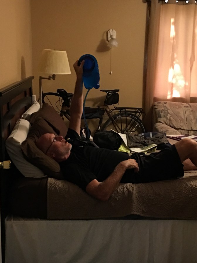 After a long, hot, fast ride…getting off the bike and stepping into a room is somewhat disorienting. But this was more so than usual. We crossed a large hall to find Bethany, grand daughter of the hotel owner, working the desk. Kevin asked, and she confirmed, that the hotel was previously an Assisted Living Facility. Perfect resting spot for recently retired Mr. Shriver.