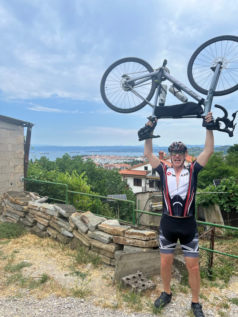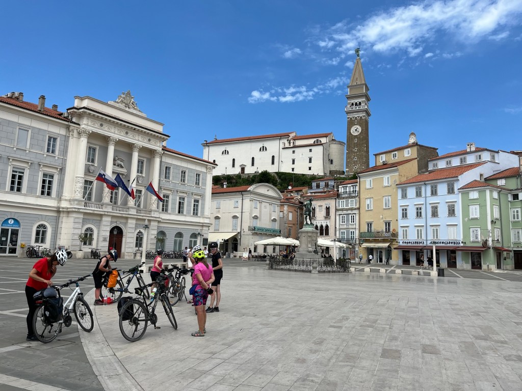 Absolutely lovely day winding around on bike paths, dodging tourists and riding very rough cobbles. Kevin had a flat right before getting on the boat back to the start. We also had an incredible fresh seaside lunch with Tomaz and Peter each having a bottle of wine.