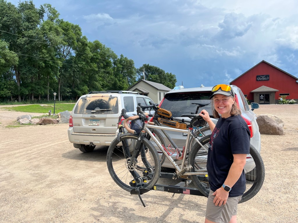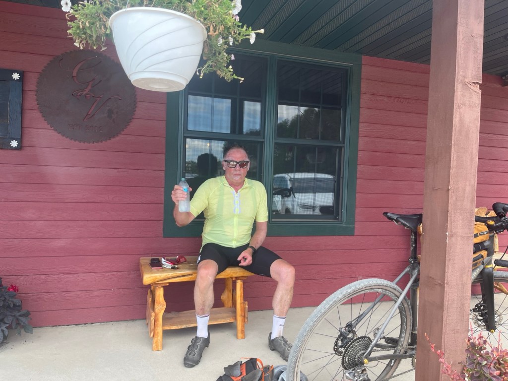 STAGE 0: How can you have a stage 0? Drive 3 hours to Gary SD the week before the race. Katie rides the first leg of 34.25 and Kevin rides the second leg of 28 then drive 3 hours home. We figured it was worth the day considering we were going to ride this in the middle of the dark night. We left before 5:30 Am but it didn’t help as the temperature was 93 degrees the humidity was 70%. We both felt like dogs and were happy to drink shitty fruit wine and have pizza at the Grandview Winery on a gravel road in the middle of nowhere.
